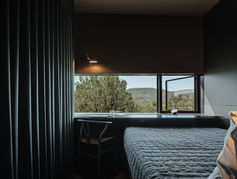 The house contains 3 bedrooms, each with a gorgeous view of the mountains to the south. All 3 have a queen size bed. The master and first guest bedroom are identical, except for the view. Both have a closet with a dresser to store and hang clothes. The third bedroom is slightly smaller, but still has drawers for unpacking. All 3 bedrooms have an office desk the width of the room. The bedrooms are cozy and bring a cabin feel to this modern house.
